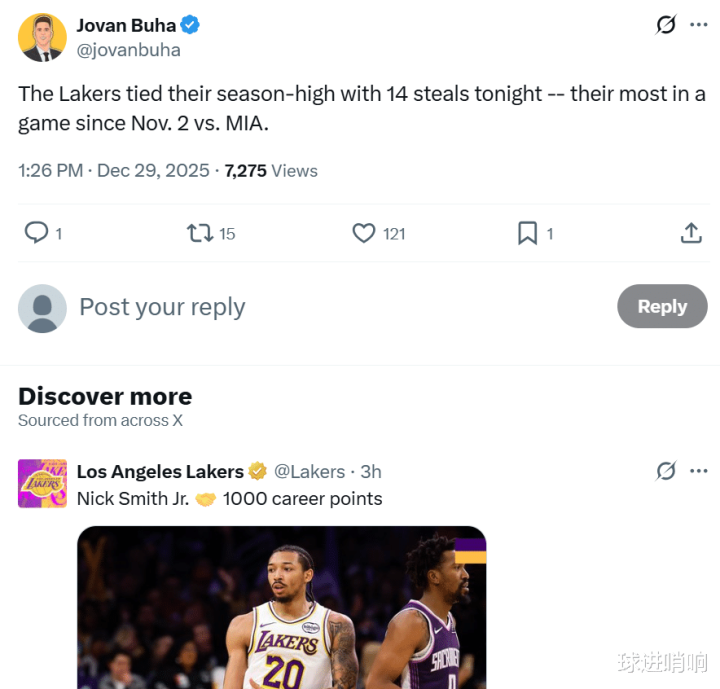 本场不仅6人上双,替补的奇兵史密斯还拿下21分,同时全队送出14次抢断追平湖人本赛季单场纪录。