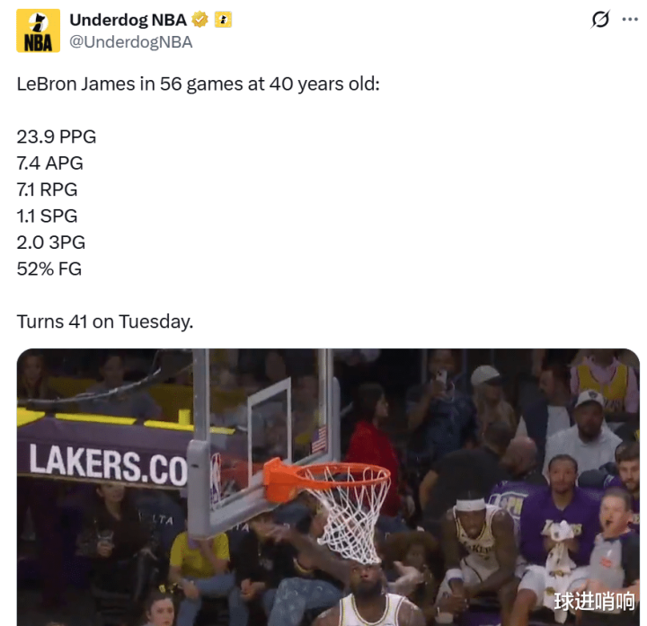 同时过去4场命中率连续超过50%,并且詹姆斯即将年满41周岁。