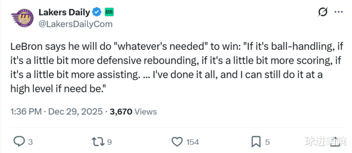 除此之外,詹姆斯再一次公开强调:“只要能够赢得比赛,我愿意做任何事情,无论是持球、还是更多的得分、更多的助攻,还是更多的防守篮板,亦或者是减轻一点点东契奇的压力,如果他需要的话。”