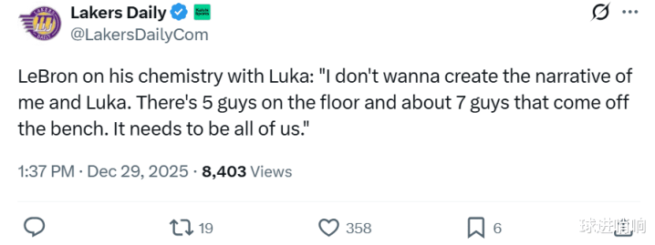 谈到至于与东契奇的关系,詹姆斯希望外界不要炒作自己和东契奇的话题:“我不想外界可以炒作我和东契奇的话题,场上有5名首发球员,替补席还有7人待命,球队胜负与否,我们都荣辱与共,必须是全队所有人的事。”