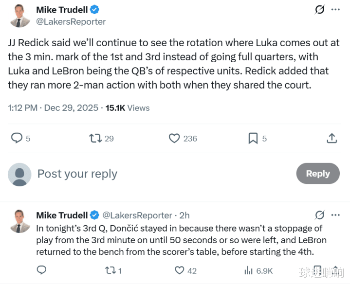 赛后雷迪克也公开表示未来一段时间球队都会采取和本场完全相同的轮换:“第一节和第三节不再让东契奇打满,而是在还剩3分钟时让他下场,这样东契奇和詹姆斯将担任各自进攻组中的指挥官。”